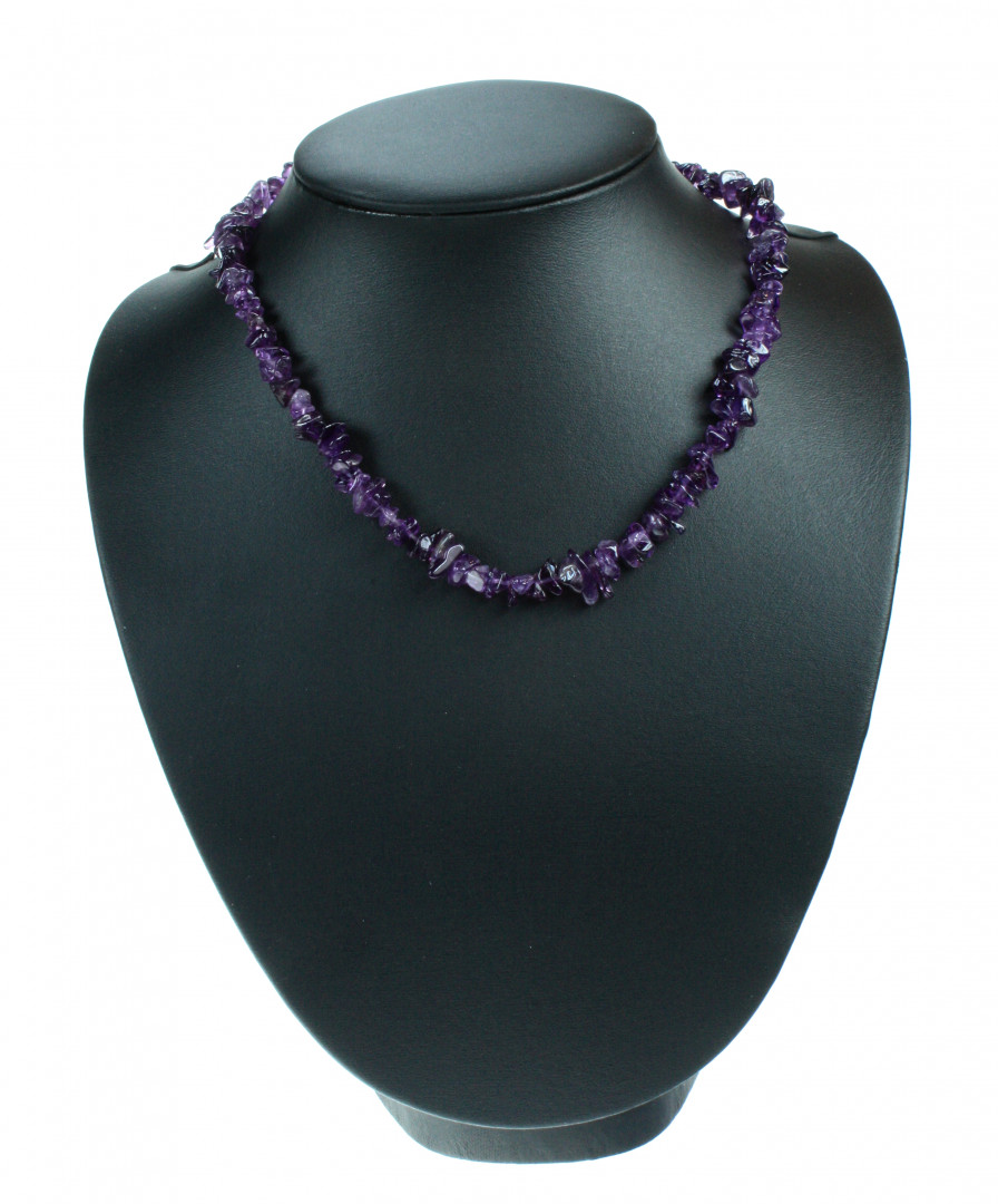 Halskjede med chipsformede ametyst med enkel sølvlås. Kort og lekkert lilla kjede.