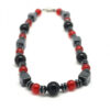 Kraftig. flott kjede med kombinasjon av kuber i hematitt og store. rosa kuler. 45cm langt med sølvbelagt metallås.
