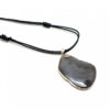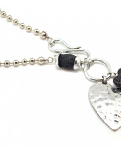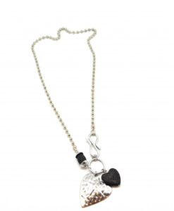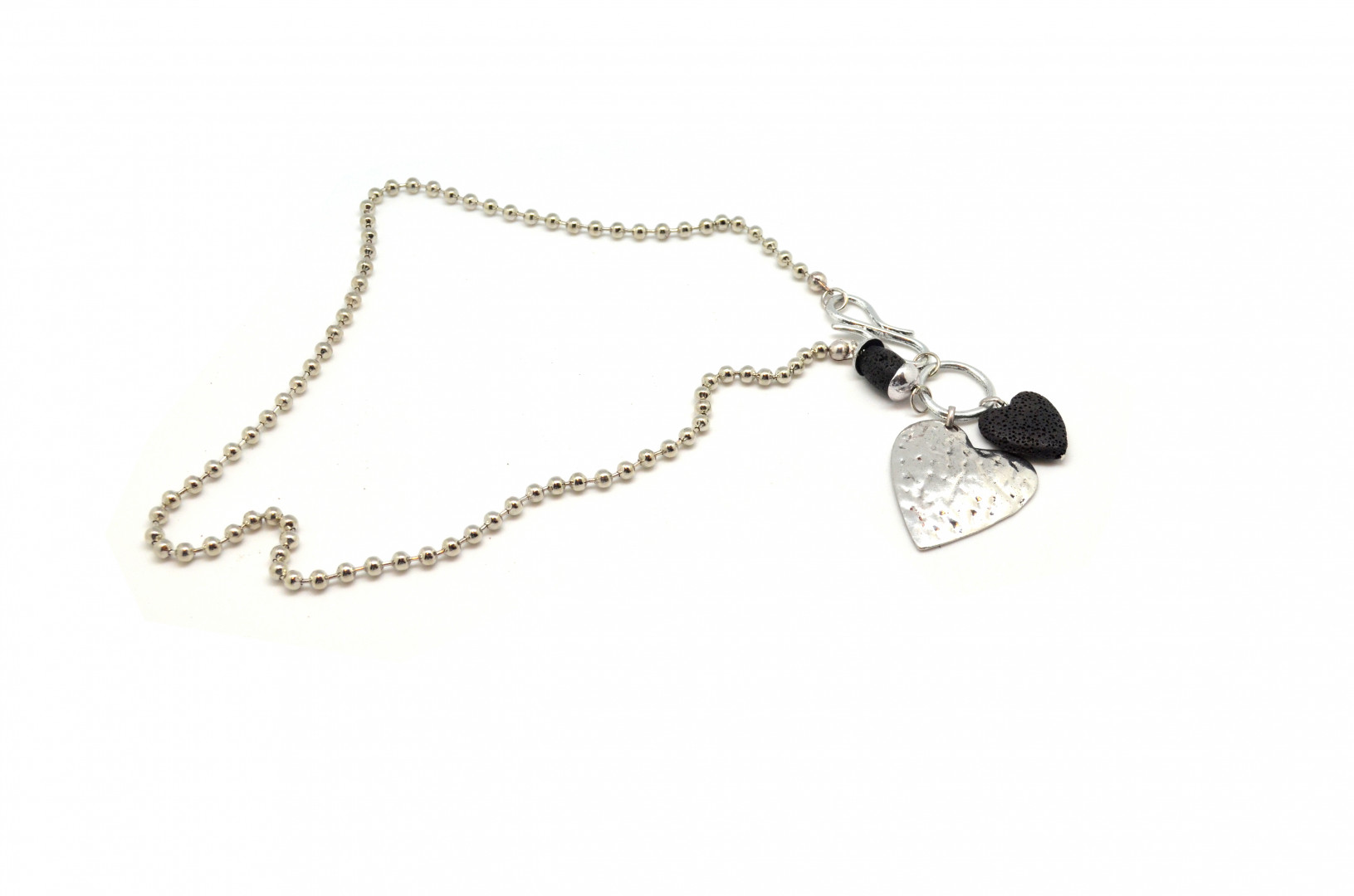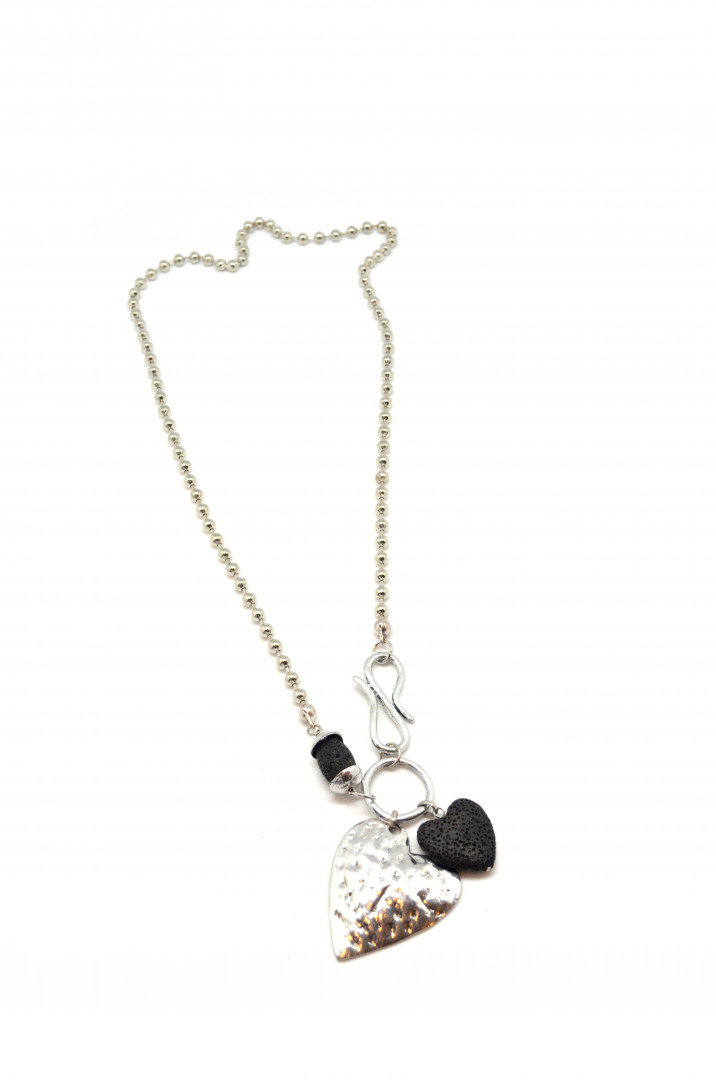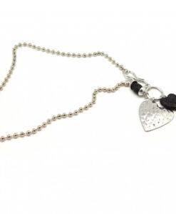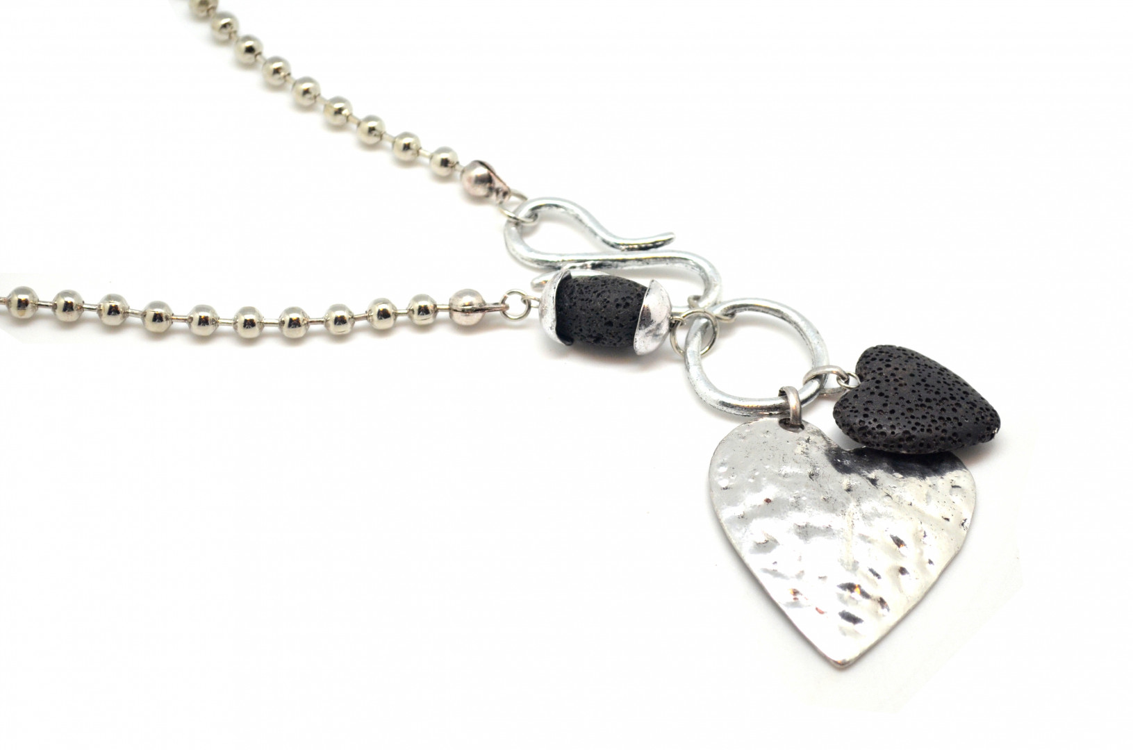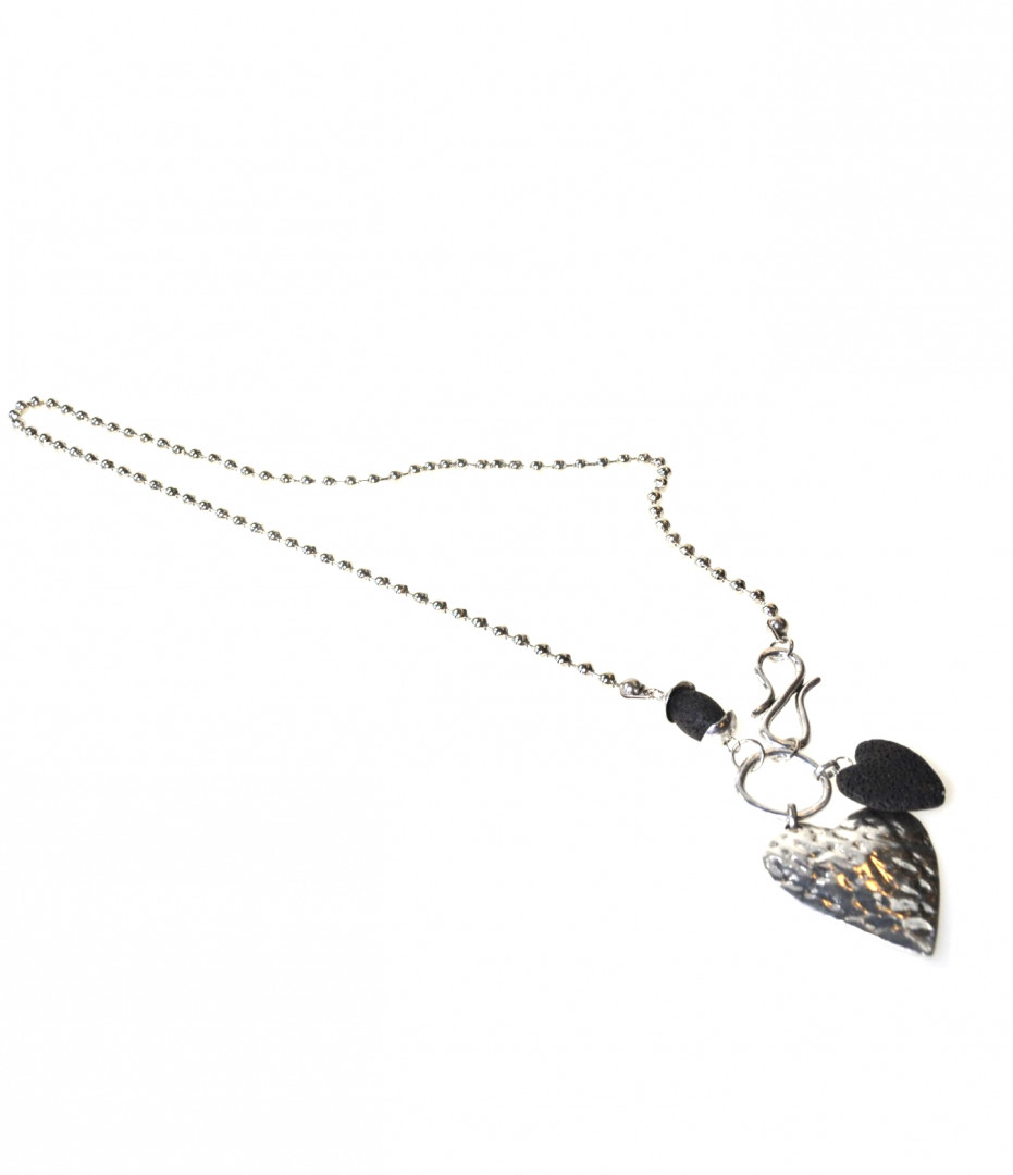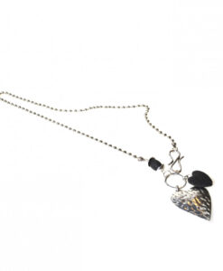 Langt kjede med et stort. lekkert banket hjerte. sorte stein og metalldeler