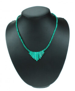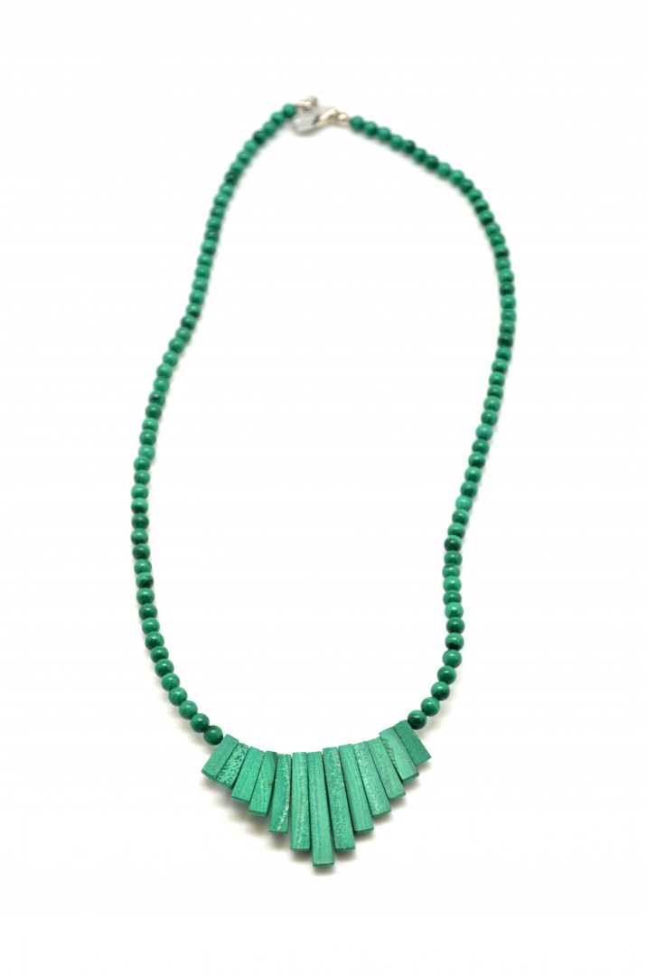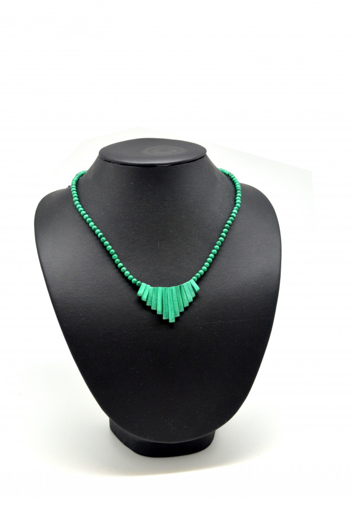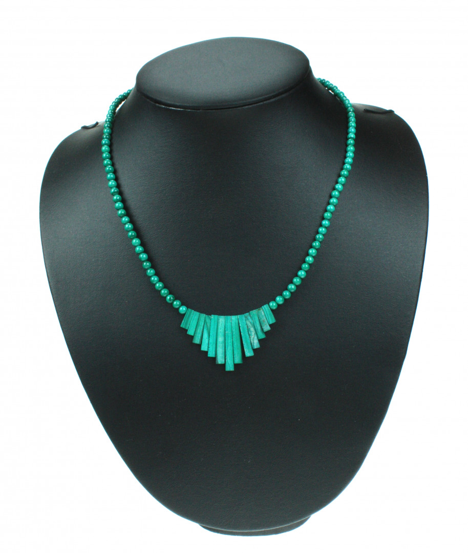 Malakitt halskjede i flott. behagelig grønnfarge. Kjedet har en elegant «vifte» i front. 45 cm langt med 4mm kuler.