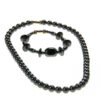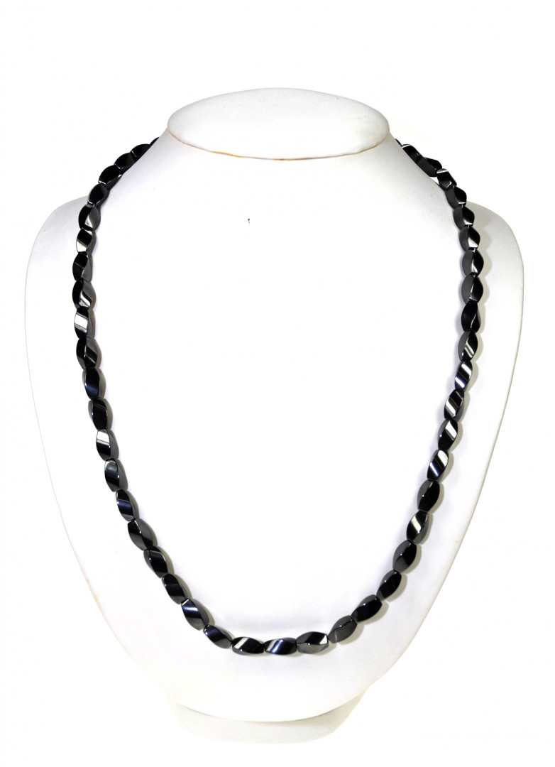 Hematitt halskjede med avlange, vridde hematitter som skinner. 61 cm langt og kan trekkes over hodet. Kjedet har sølvlås.