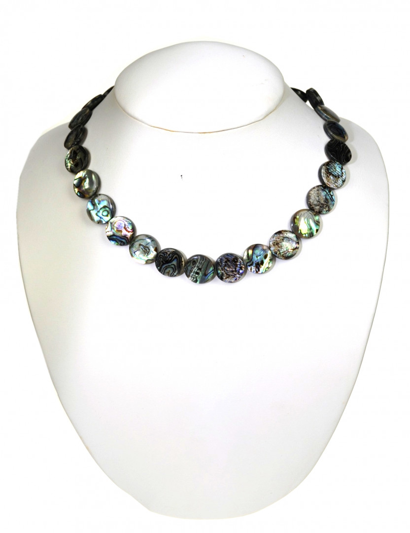 Pauaskjell-kjede med runde, flate blå/grønne pauaskjell og sølvlås.