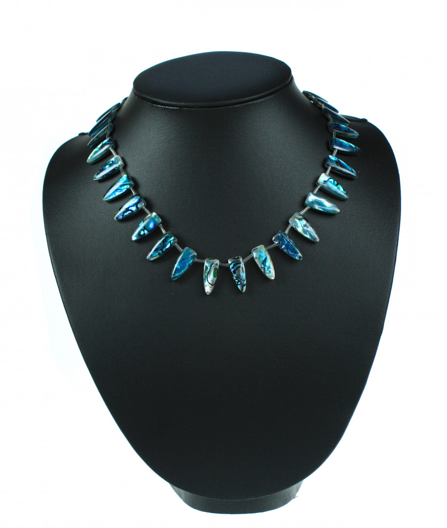 Pauaskjell-kjede med triangelformede blå/grønne pauaskjell og sølvlås.