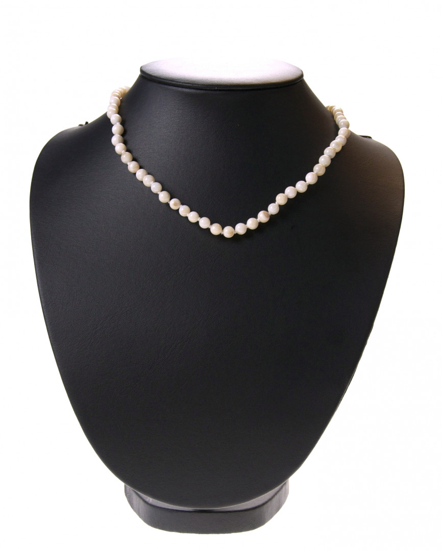 Halskjede med 6mm kuler i lys perlemor. 42cm langt med sølvlås.