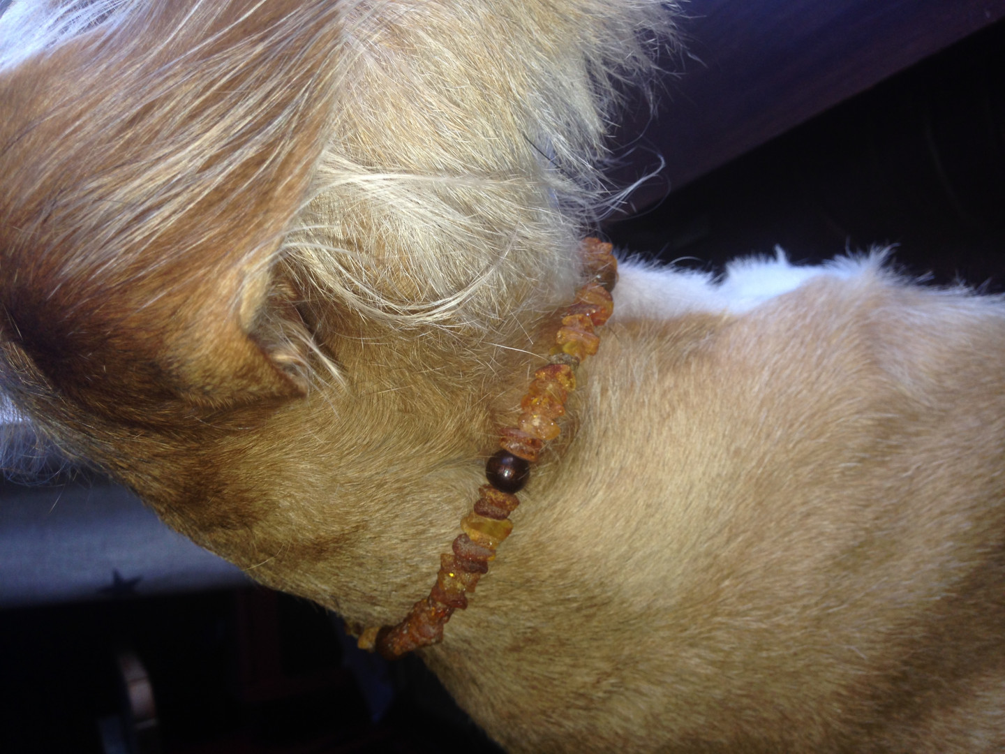 Hundebånd med ekte ravsteiner som ved hjelp av gnissing mot pelsen, holder flåtten borte. Til liten hund.