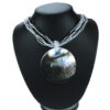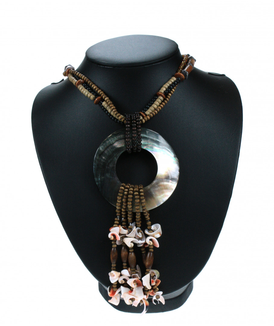 Kraftig kjede med brune trekuler og stort skjell med hull i .