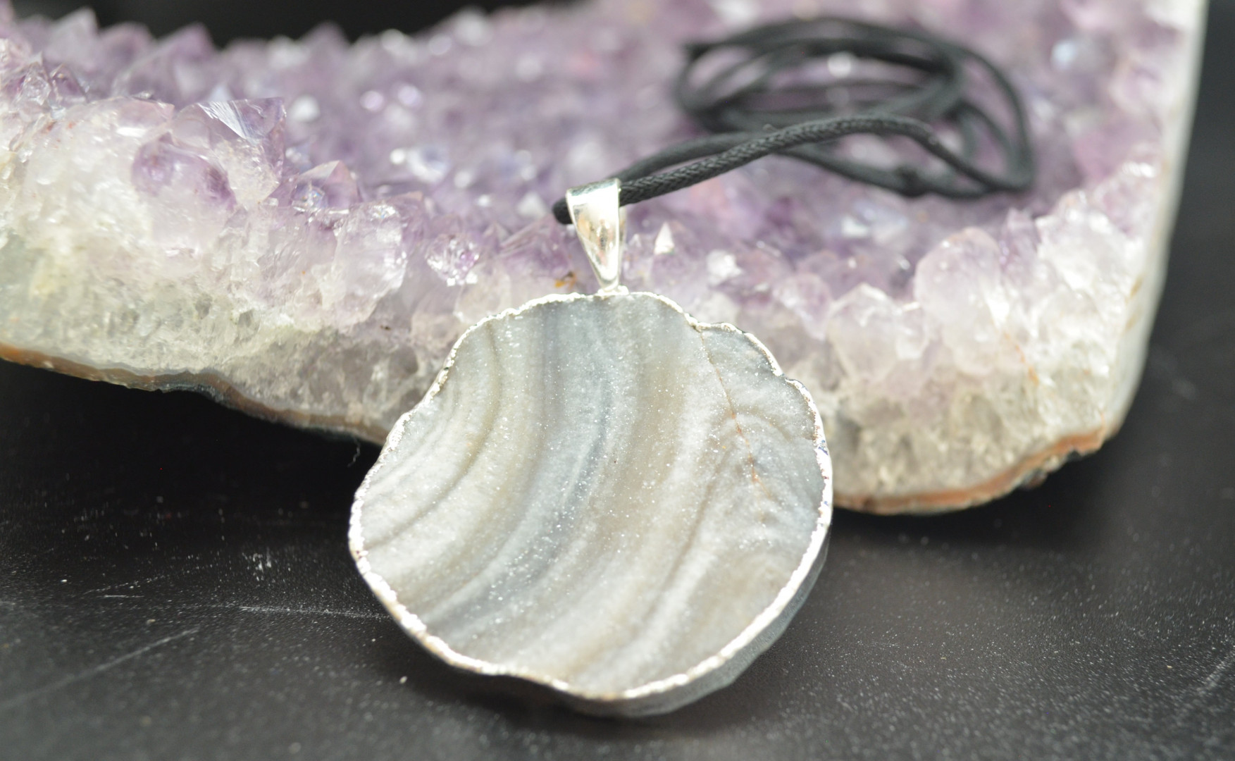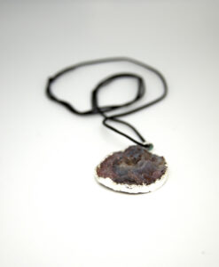Stort agatanheng med små. glitrende krystaller og sort lærsnor.