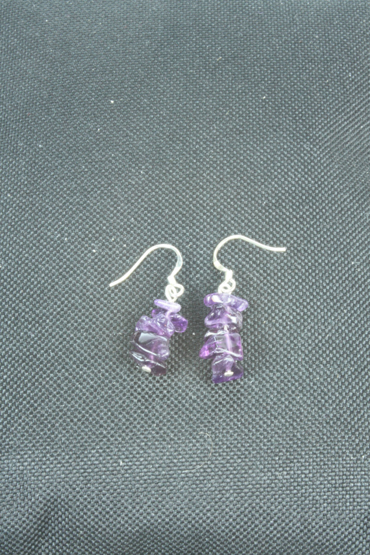 Ørepynt med 4 chips-steiner i ametyst hengende i sølvkrok.