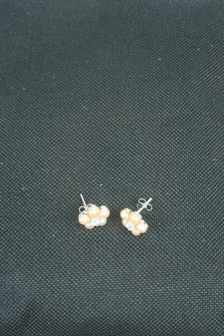 Nydelige blomsterformede ørepynt med aprikosfargede perler og kvartskrystall i midten.
