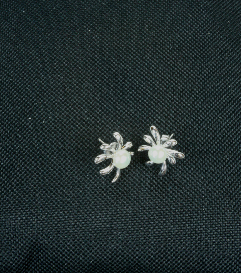 Ørepynt med hvit ferskvannsperle og 8 klør i sølv og sølvstikk.
