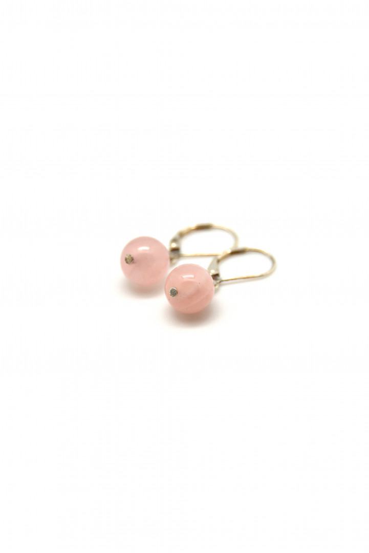 Ørepynt med stor kule i rosa kvarts og krok med enkel og sikker lås i sølv.