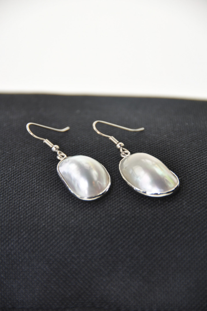 Ørepynt med skinnende, hvite skjell og sølvkrok.