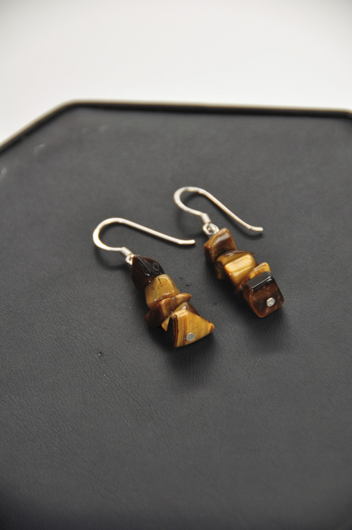 Ørepynt med chips i tigerøye hengende i sølvkrok.