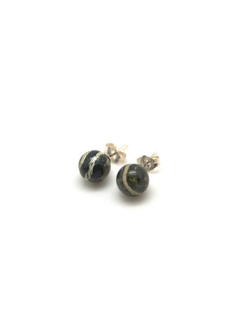 Ørepynt med kule i grønn og hvit stripete zebra serpentin med sølvstikk.