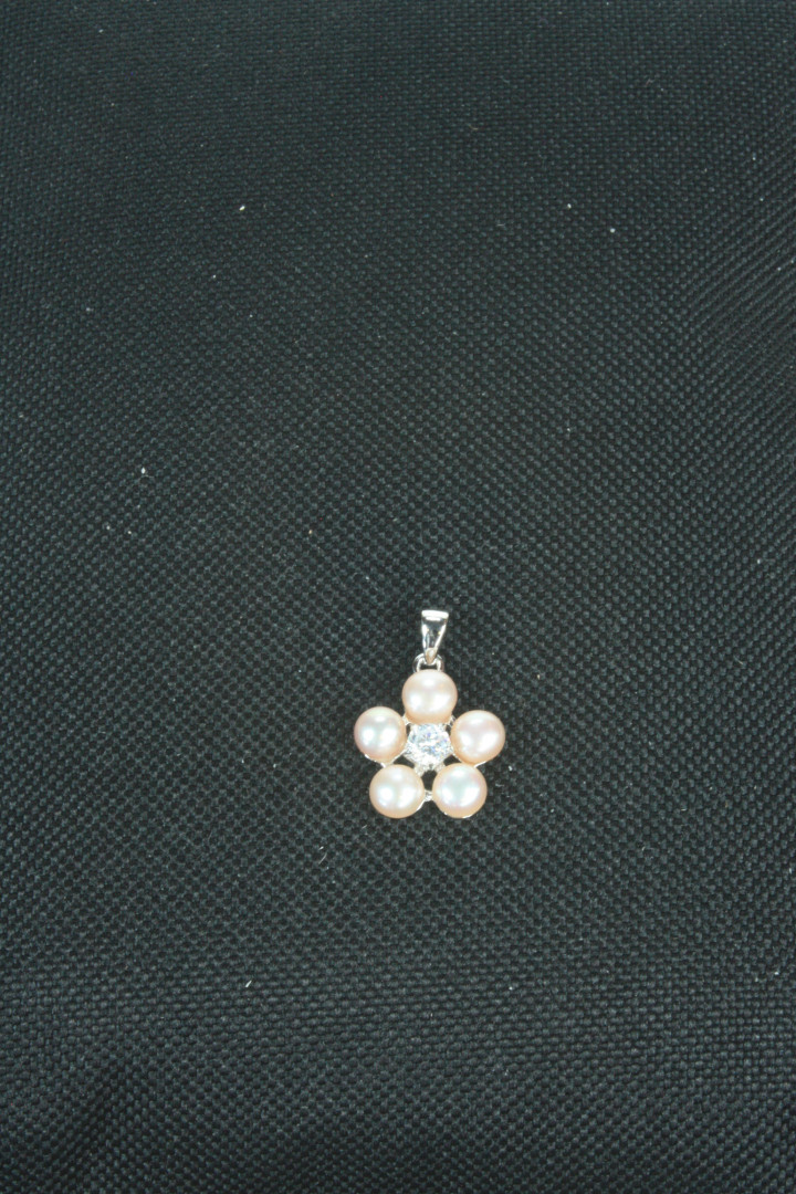 Blomsterformet anheng med aprikosfargede perler og kvartskrystall i midten.