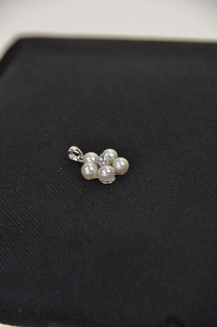 Blomsterformet anheng med hvite perler og kvartskrystall i midten.