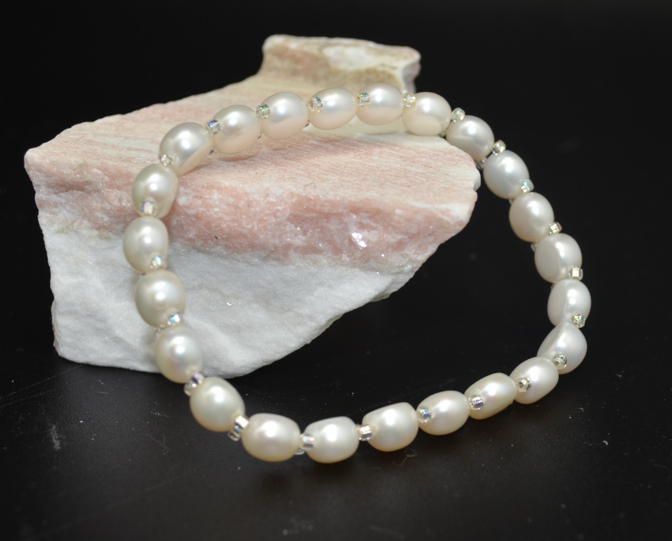 Elastisk armbånd med flate ferskvannsperler. 17-18cm.