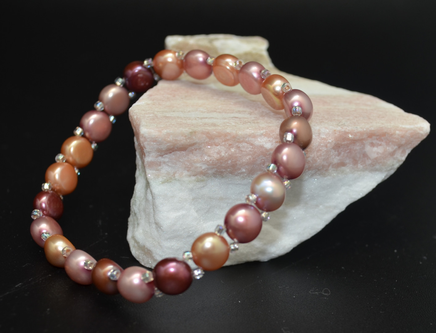 Elastisk armbånd med flate ferskvannsperler. 17-18cm.