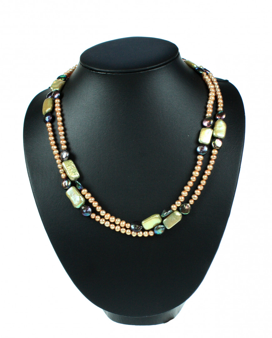 Langt kjede med gyldne små og store rektangulære perler. Uten lås.