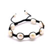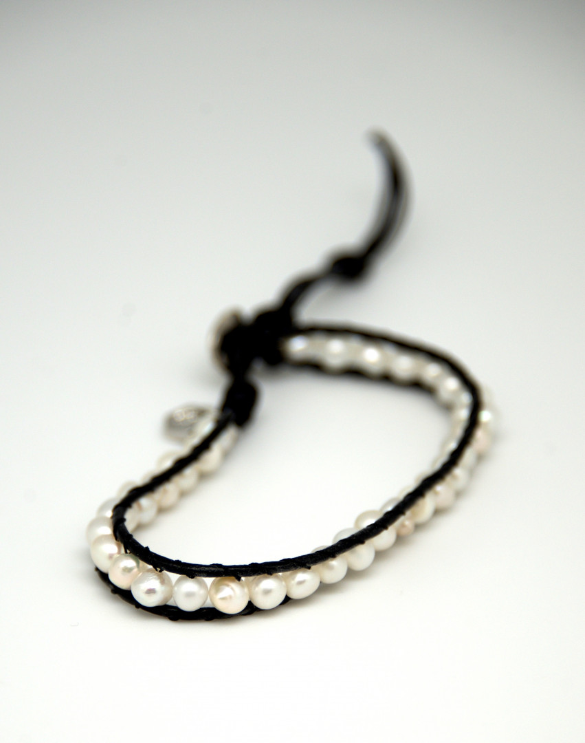 Sort lærarmbånd med små «potetformede», hvite perler. Armbåndet har 2 størrelser som kan reguleres med en metallknapp.