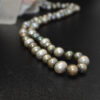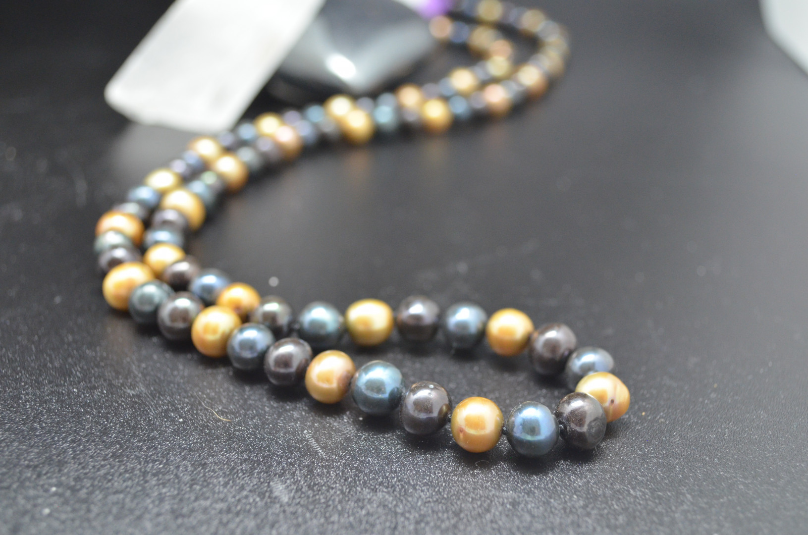 Langt, flott perlekjede med mørke fargede ferskvannsperler. 10 mm store perler med knute mellom hver perle.