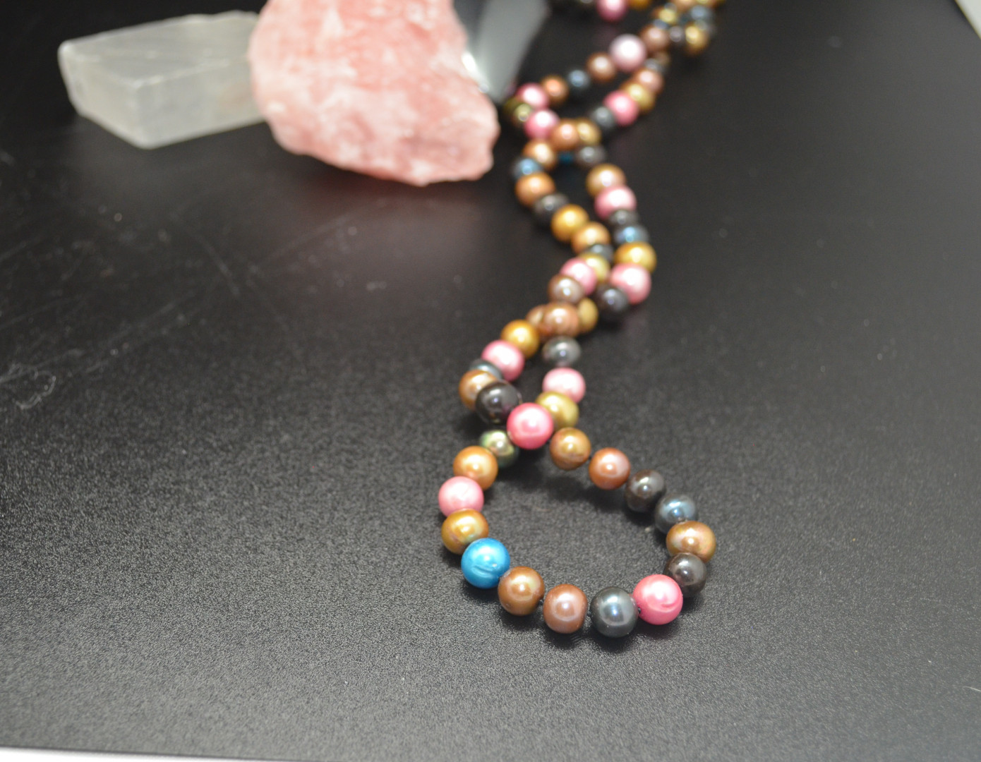 Langt perlekjede med fargede ferskvannsperler. 10 mm store perler med knute mellom hver perle.