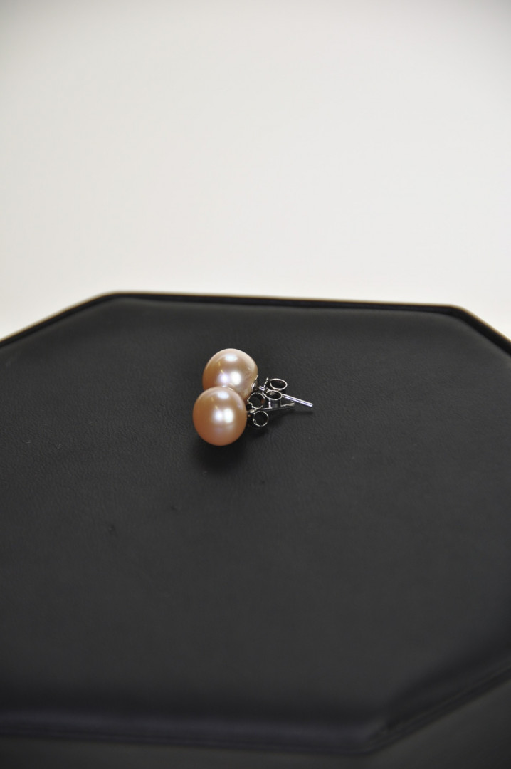 Ørepynt med flat perle i aprikosfarge med sølvstikk.
