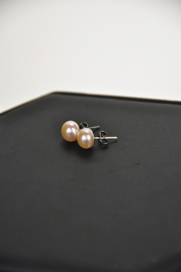 Ørepynt med flat perle i aprikosfarge med sølvstikk.