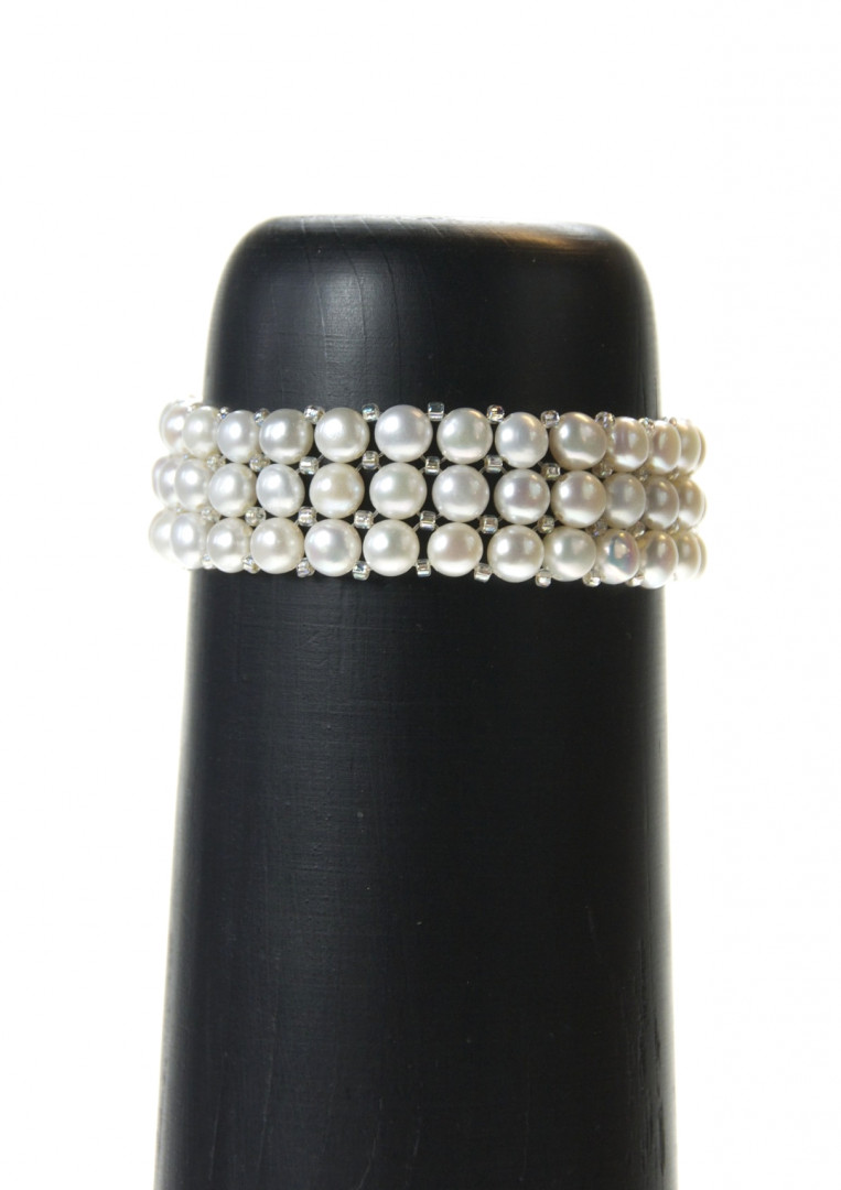 BESTSELGER!! Elastisk armbånd med 3 rader av hvite, flate perler.