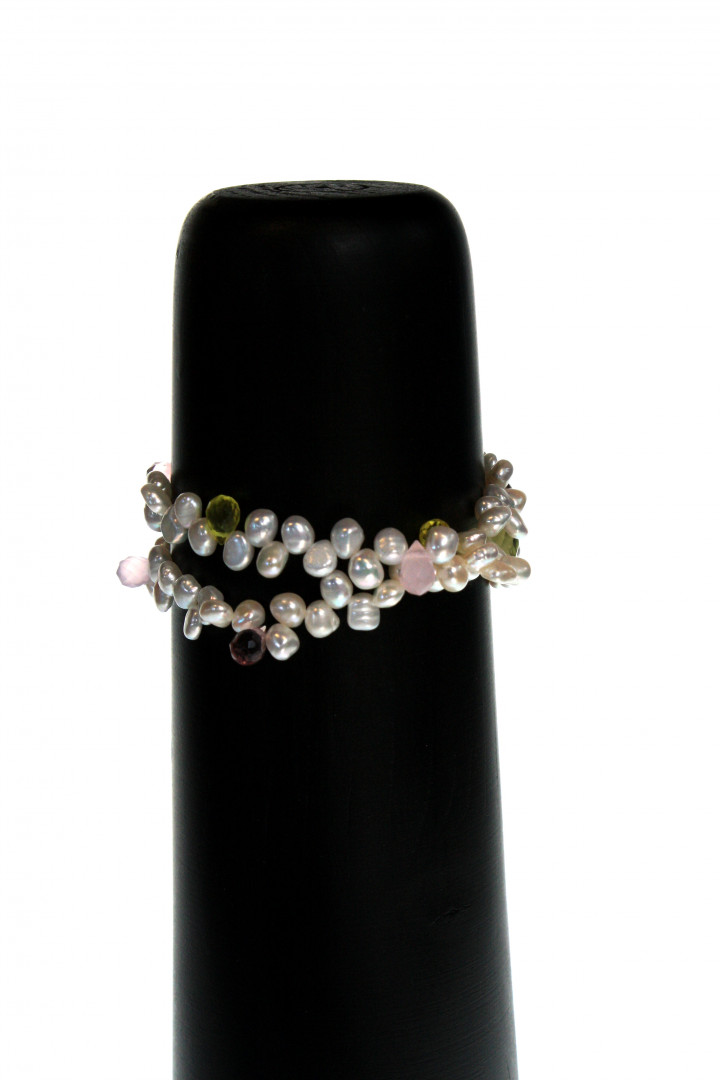 Armbånd med 2 rader. Hvite perler og fasettslipte grønne og lilla stein.