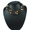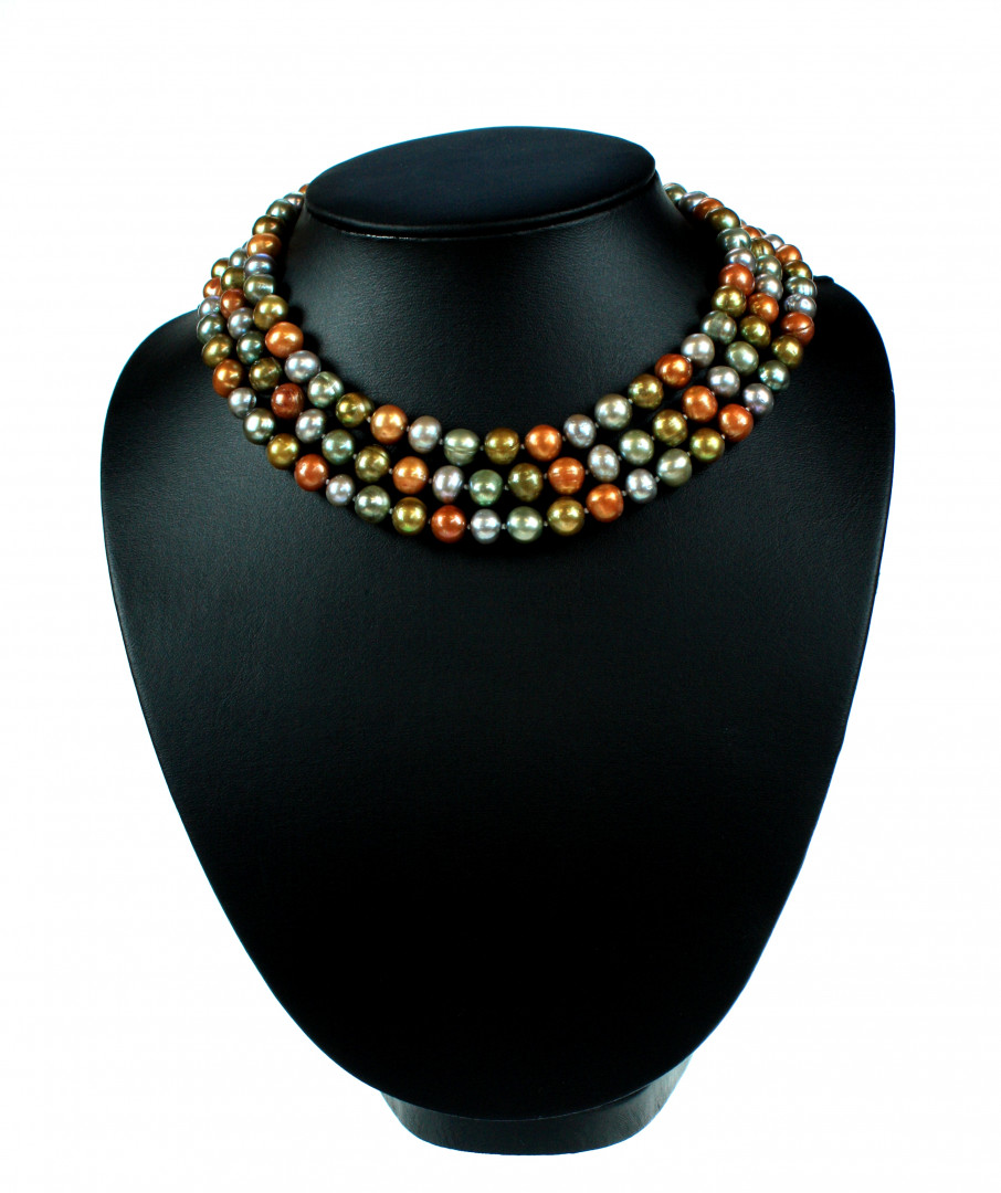 Langt perlekjede i mørke grønne farger og bronse. Det er knute mellom hver perle. Kjede kan tas en eller to ganger rundt hodet eller brnyttes som et bredt armbånd.