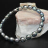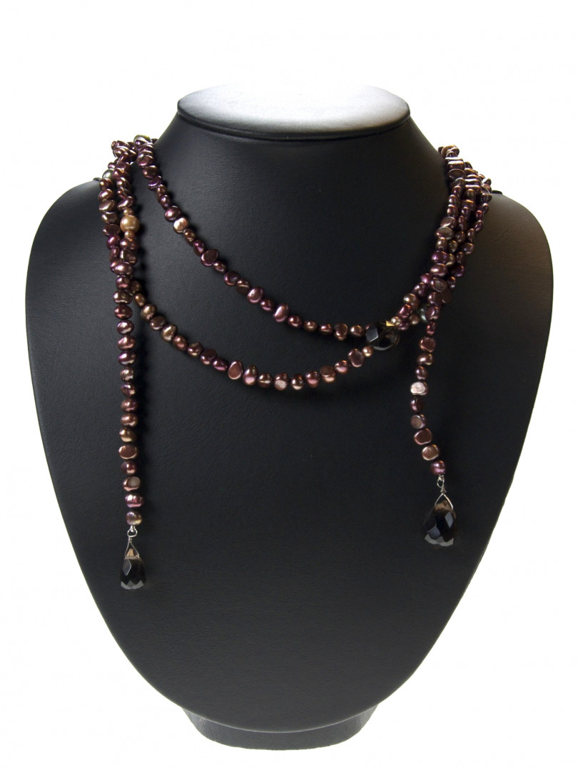 Perlekjede i mørkerød perler og facettslipte røykkvarts i endene.
