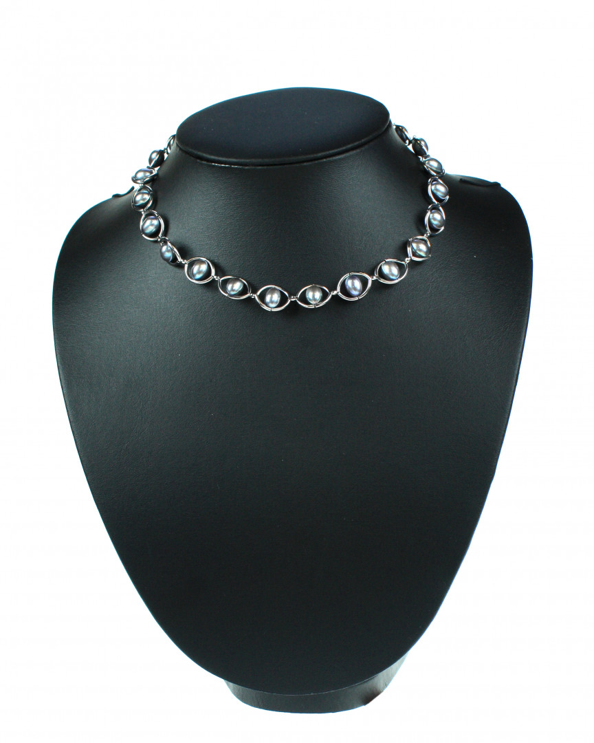 Halskjede med sølv og lilla perler.