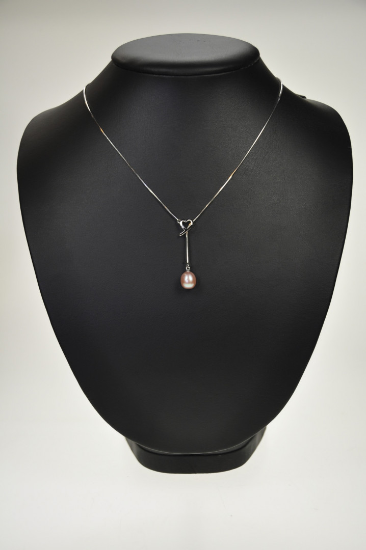 Regulertbart sølvkjede med lys rosa perle i enden.