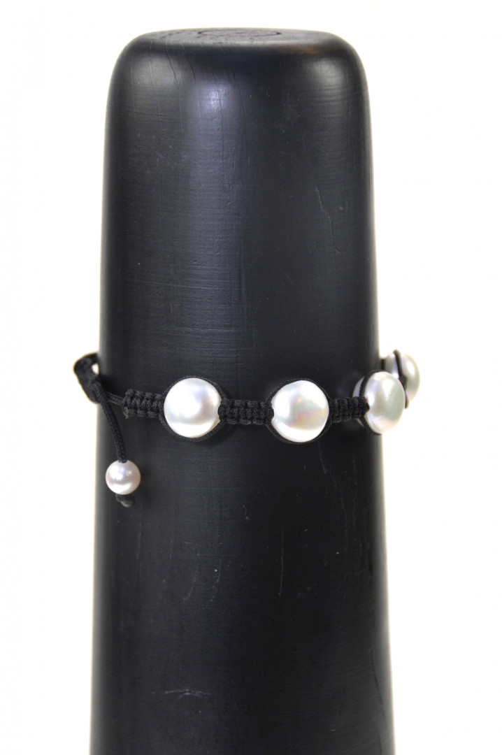 Store, hvite ferskvannsperler flettet med sort tråd. Regulerbart armbånd, som er behagelig å ha på.