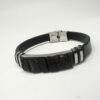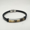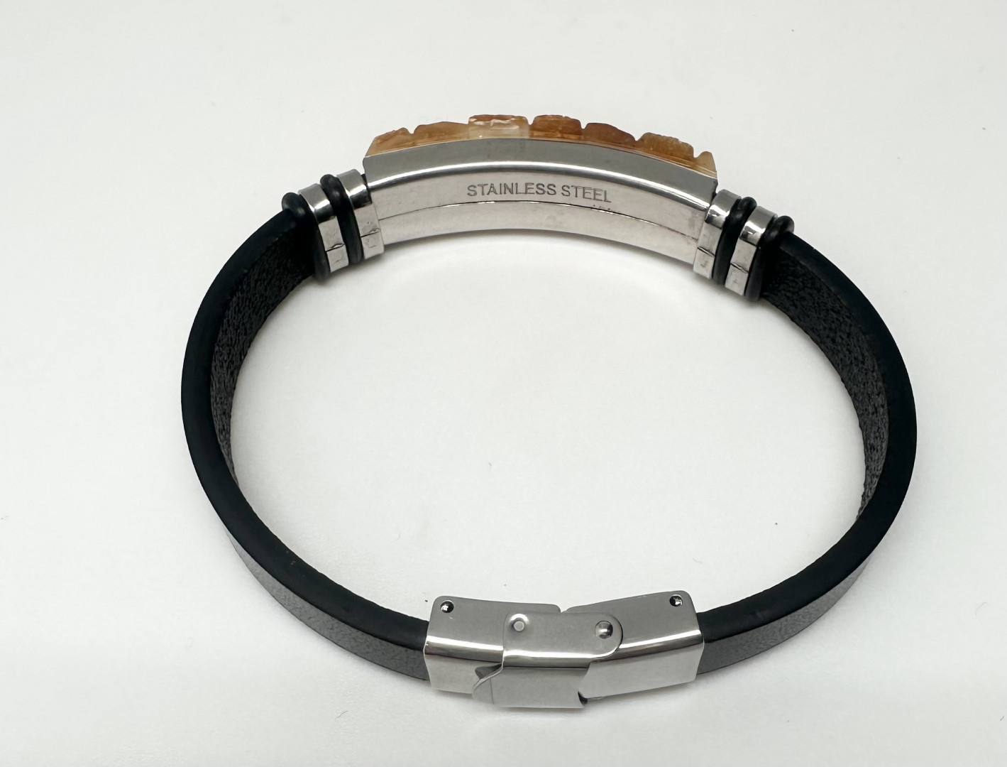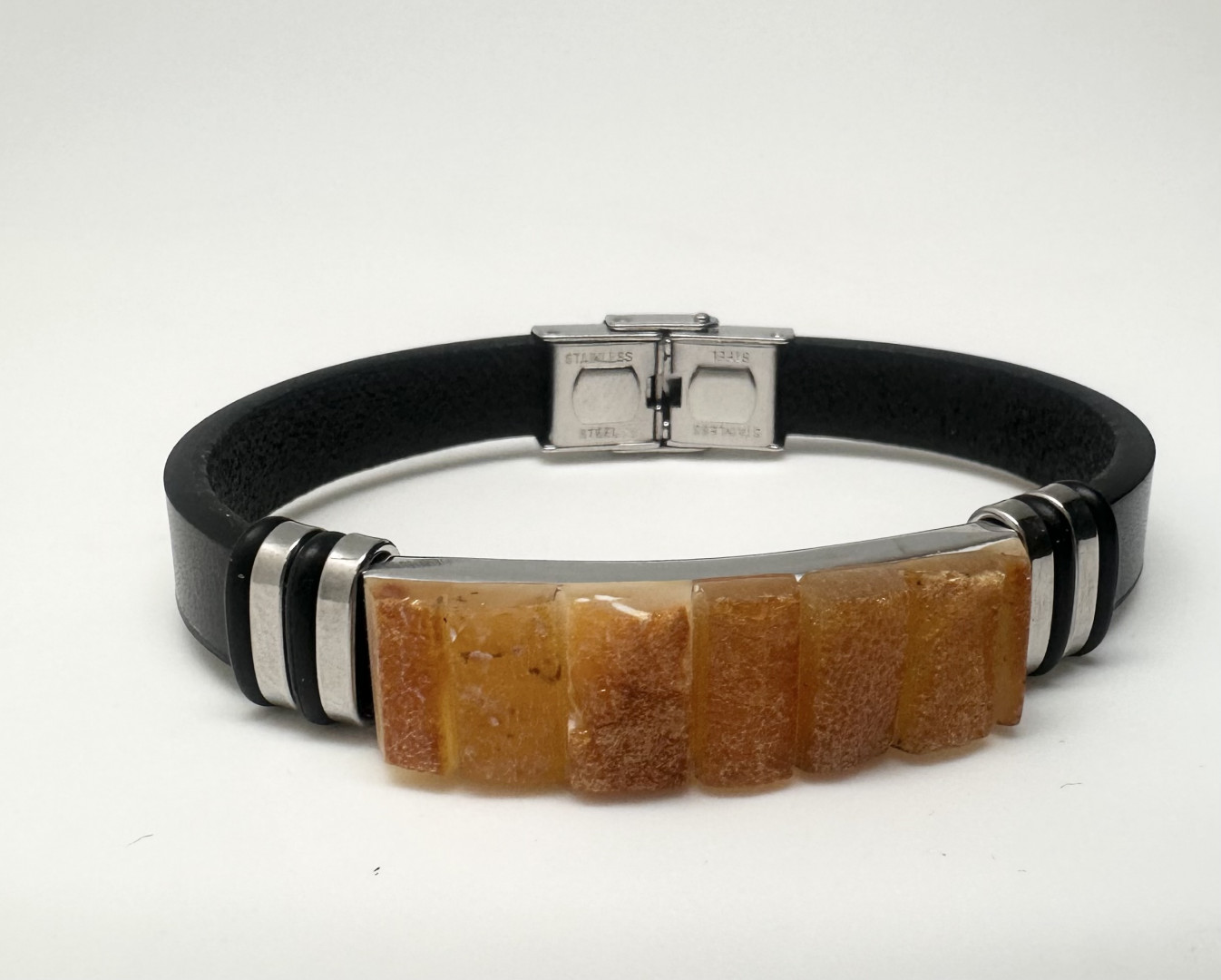 Tøft lærarmbånd med rå. gule rav og metalldetaljer. Armbåndet passer både menn og damer. Låsen er i stål helt fri for nikkel. For å endre størrelsen. tar du enkelt av låsen og klipper til lærarmbåndet til ønsket størrelse. 1 cm bredt og 21 cm langt. Lær. lås og rav av høy kvalitet.