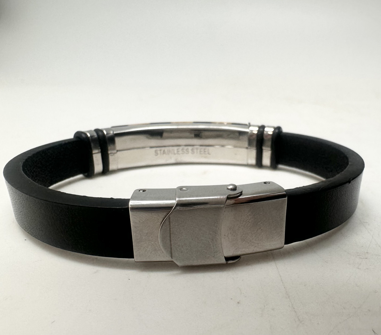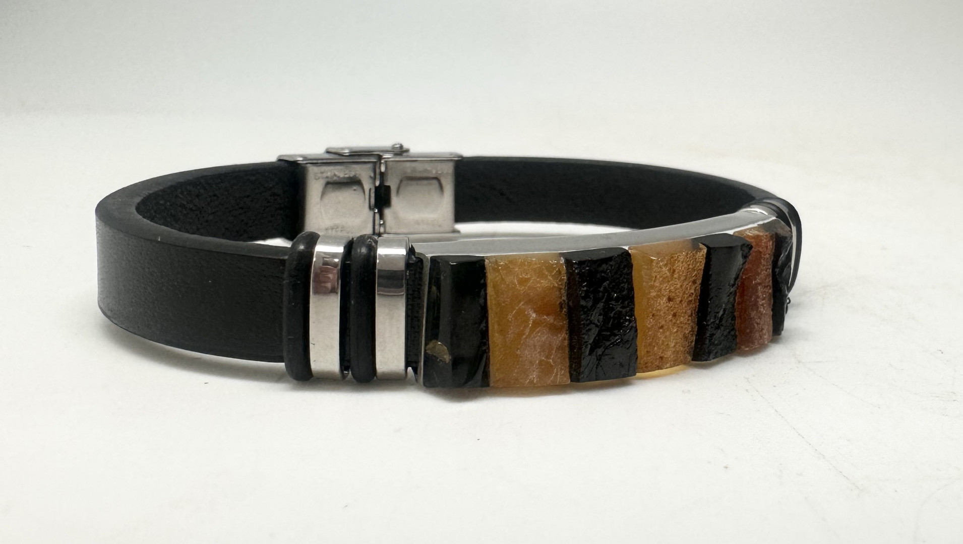 Tøft lærarmbånd med rå. gyldne oransje og sort rav sammen med kuule metalldetaljer. Armbåndet passer både menn og damer. Låsen er i stål og helt fri for nikkel. For å endre størrelsen. tar du enkelt av låsen og klipper til lærarmbåndet til ønsket størrelse. 1 cm bredt og 21 cm langt. Lær. lås og rav av høy kvalitet.