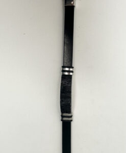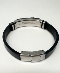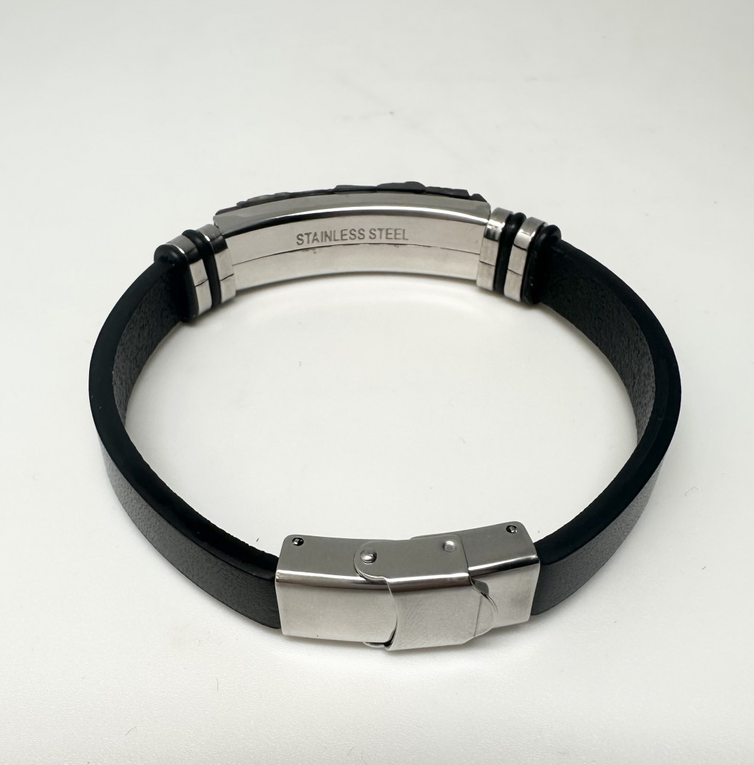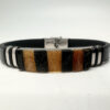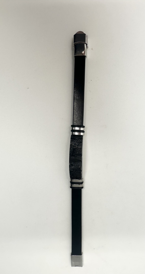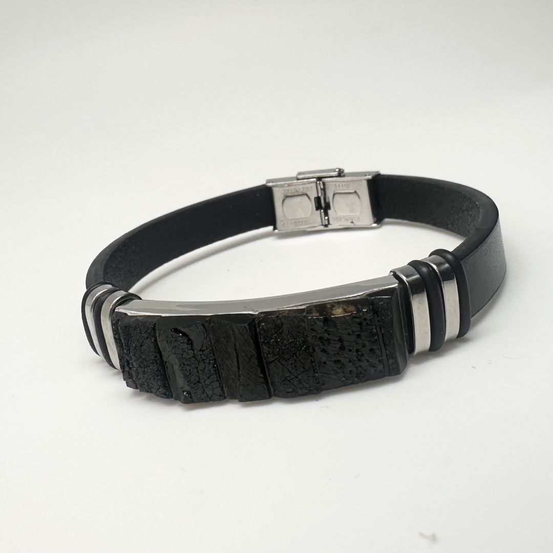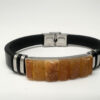 Tøft lærarmbånd med rå. sorte rav og metalldetaljer. Armbåndet passer både menn og damer. Låsen er i stål helt fri for nikkel. For å endre størrelsen. tar du enkelt av låsen og klipper til lærarmbåndet til ønsket størrelse. 1 cm bredt og 21 cm langt. Lær. lås og rav av høy kvalitet.