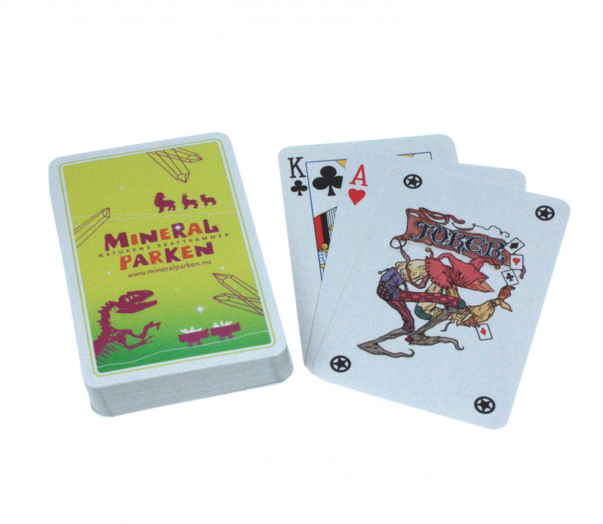 Kortstokk i plasteske med logo på baksiden av alle kort.