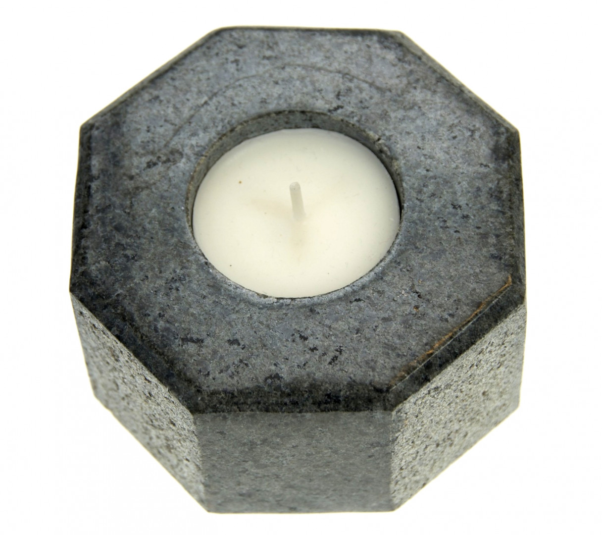 8-kantet lysestake for te-lys i mørk grå granitt som er polert på toppen.n